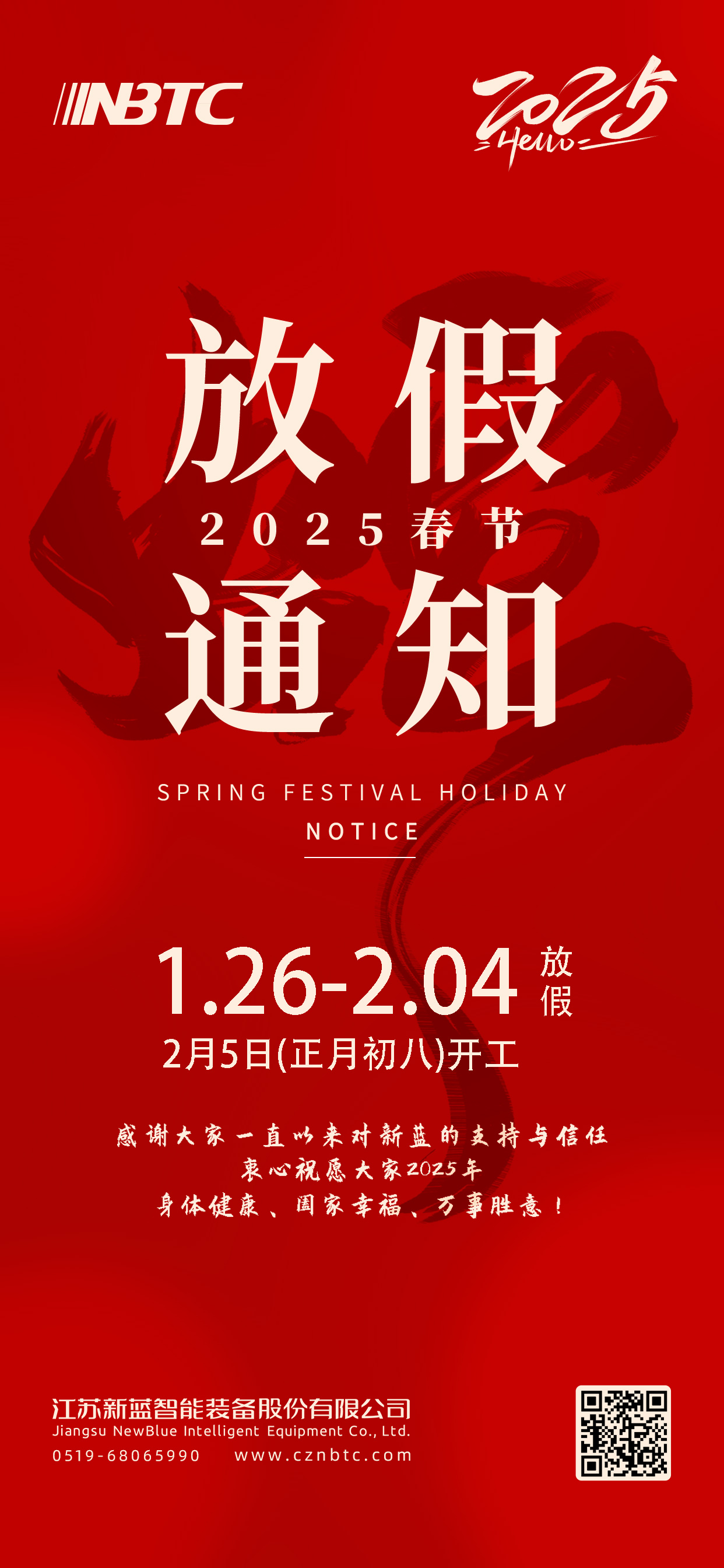 值此新春佳節(jié)來臨之際,江蘇新藍智能裝備股份有限公司向一直以來支持信任我們的各界伙伴致以最誠摯的感謝!根據(jù)公司安排,2025 年春節(jié)放假時間為 1 月 26 日 - 2 月 4 日,2 月 5 日(正月初八)正式開工。在此溫馨提醒大家合理安排假期,放松身心,盡享團圓之樂。新的一年,愿我們攜手共進,再創(chuàng)輝煌!祝大家新春愉快,蛇行大運,闔家幸福,萬事順遂!